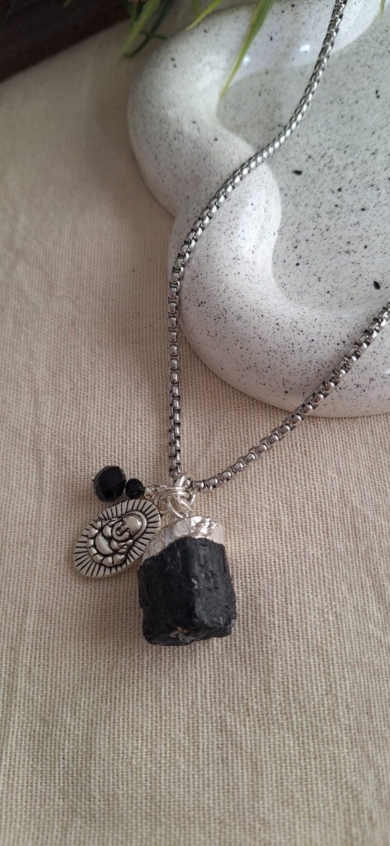 Cadena de acero quirúrgico con dije de turmalina en bruto con virola de plata.