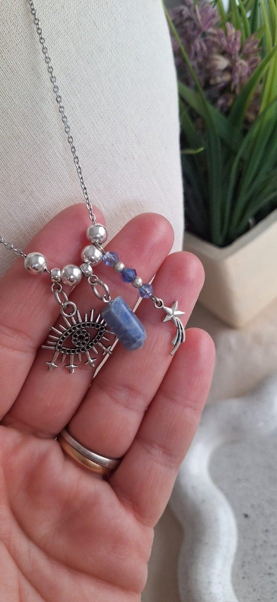 Collar de acero quirúrgico con dijes de fundición y cristal de cuarzo azul.