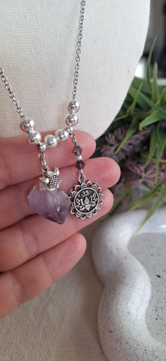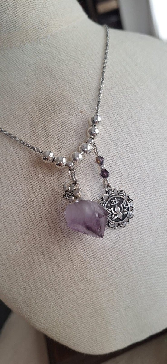 Cadena de acero quirúrgico con dije de amatista en bruto y dijes de fundición.
