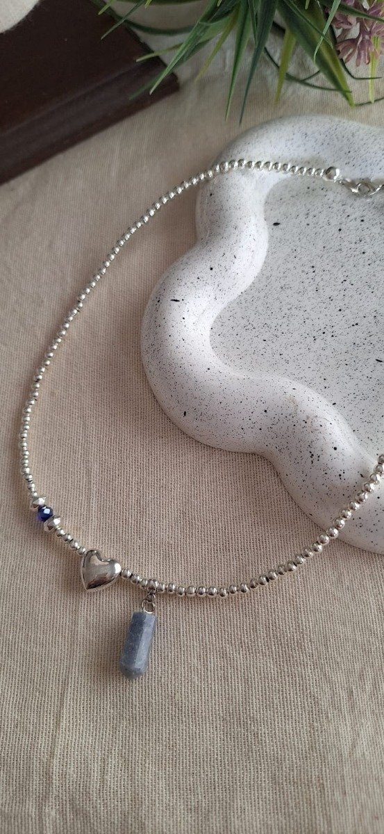 Collar tipo choker realizado en tanza de acero, bolitas de fundición, cristal de cuarzo azul.