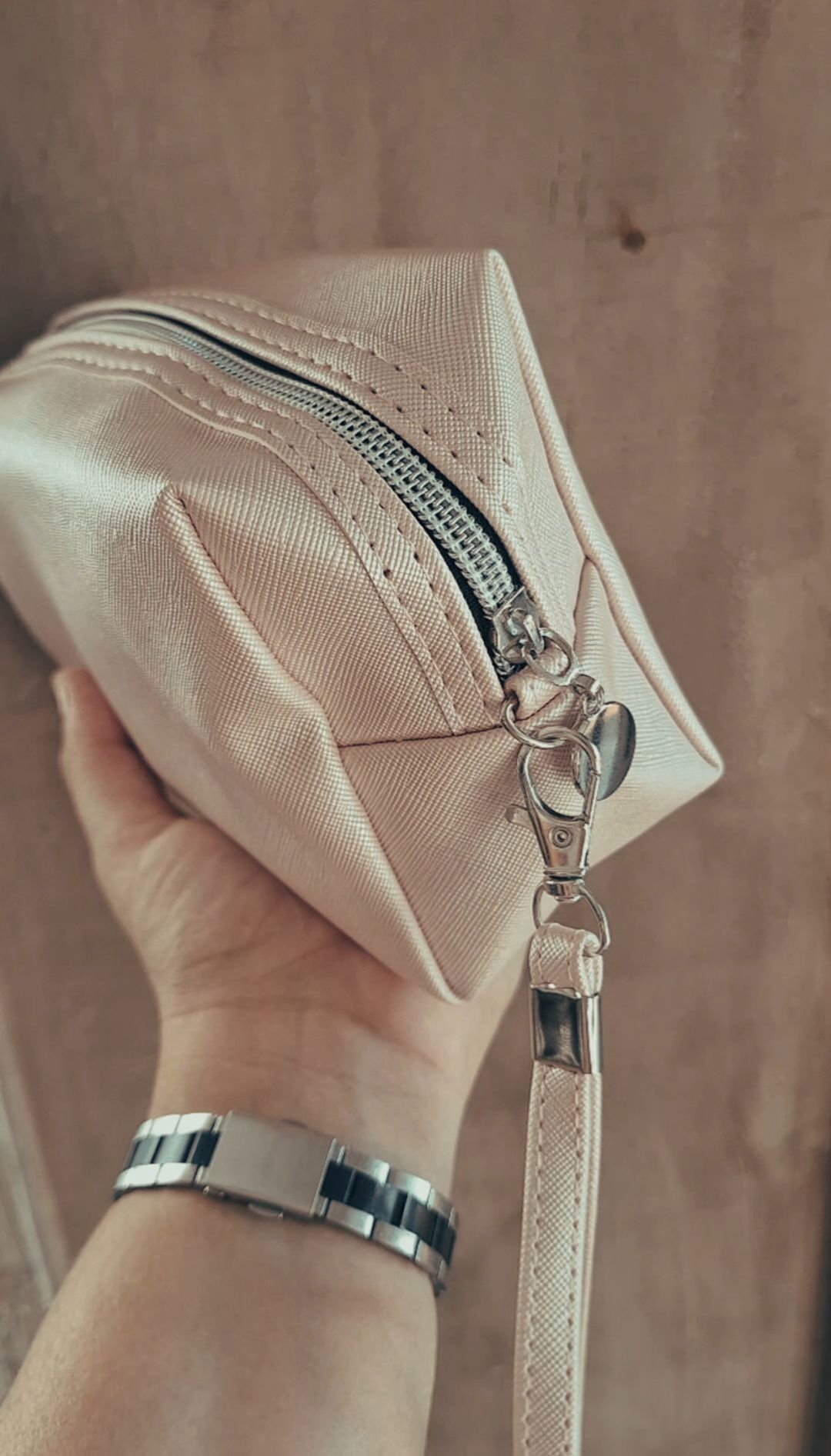 Portacosméticos de cuerina con interior impermeable, cierre superior y correa desmontable.
