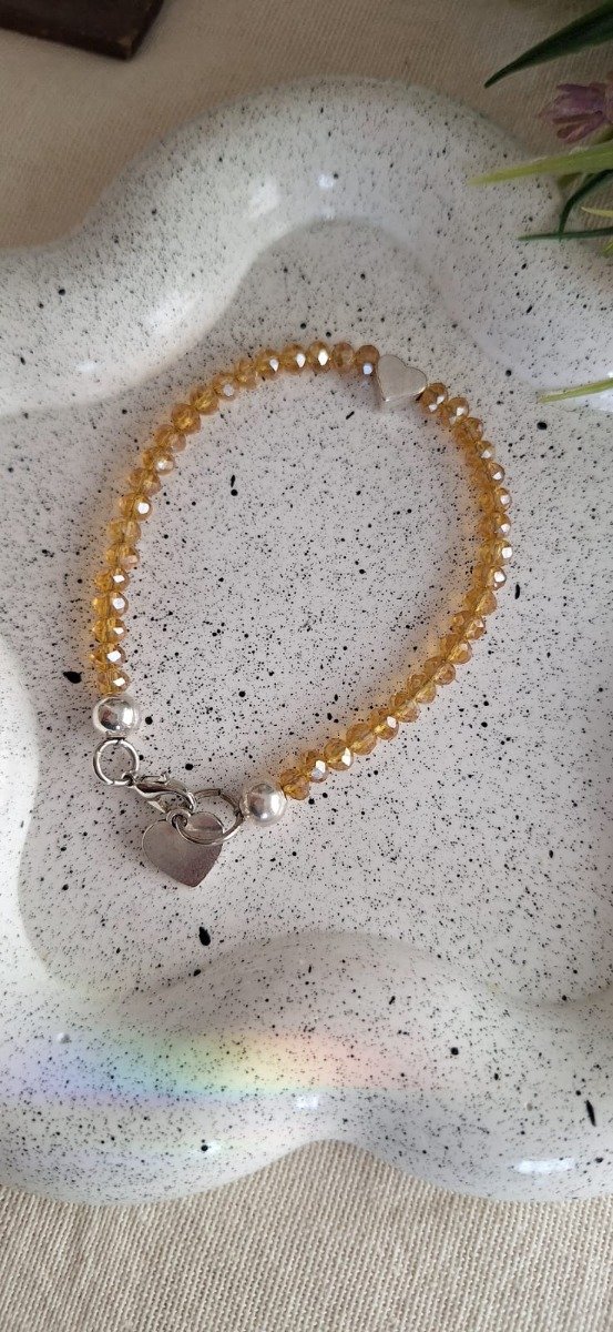Pulsera de tanza rígida con cuentas acrílicas y doble dije de corazón.