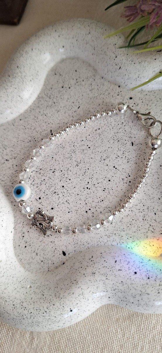 Pulsera de tanza rígida, bolitas de metal niquelado, dijecito de cerámica, y cristalitos tornasolados.