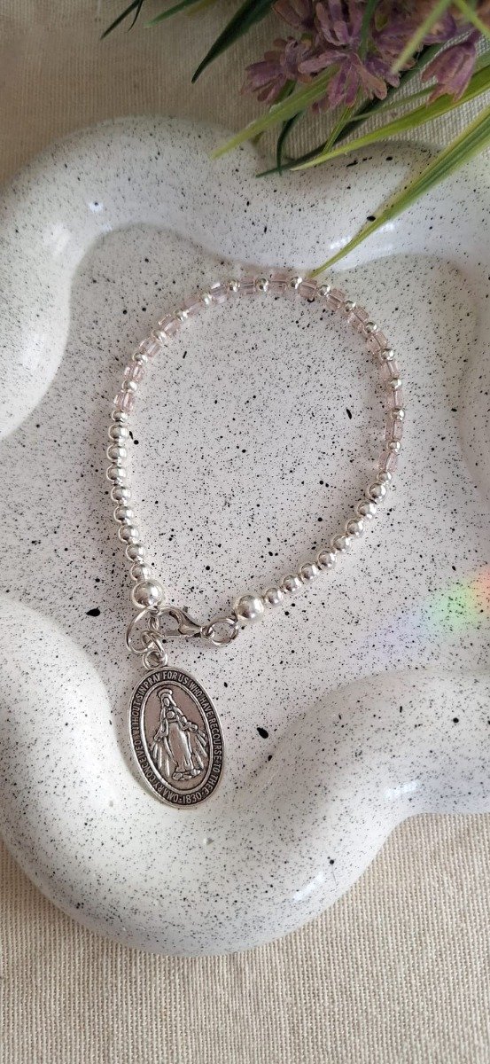 Pulsera realizada en tanza rígida con bolitas de fundición, cuentas de metal niquelado en forma de cubo y dije de La Virgen de la Medalla Milagrosa.