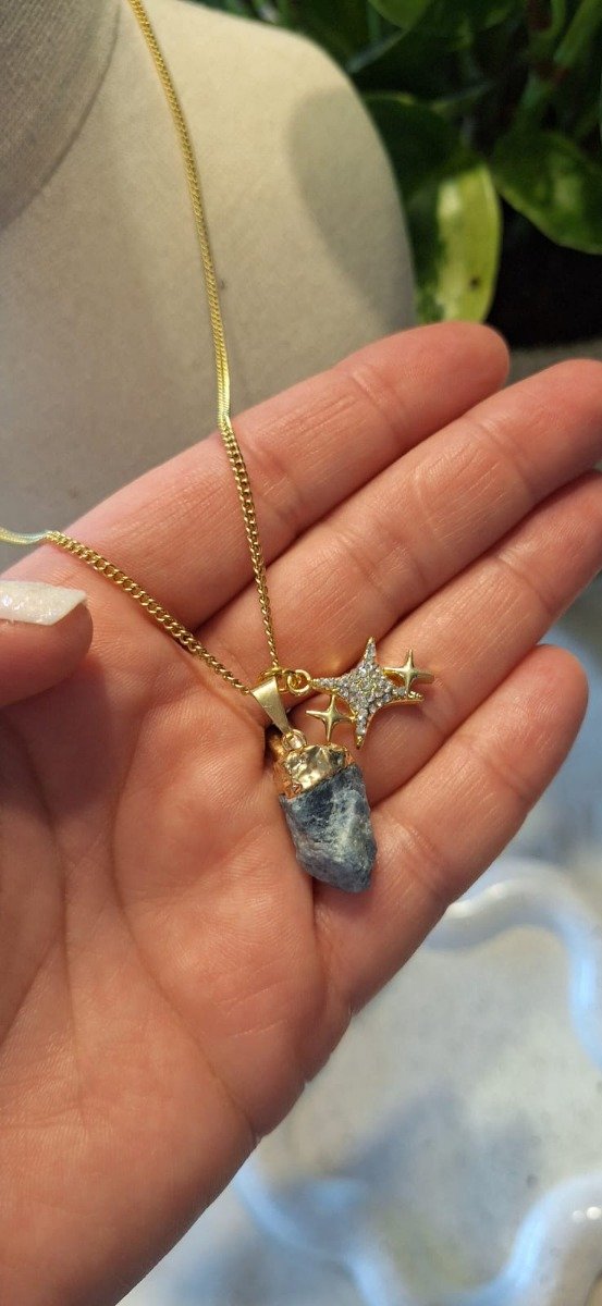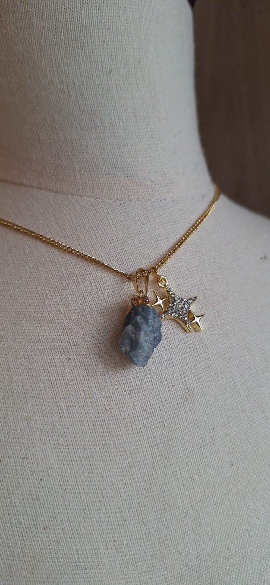 Collar de Acero Dorado, con dije de Aguamarina en bruto.