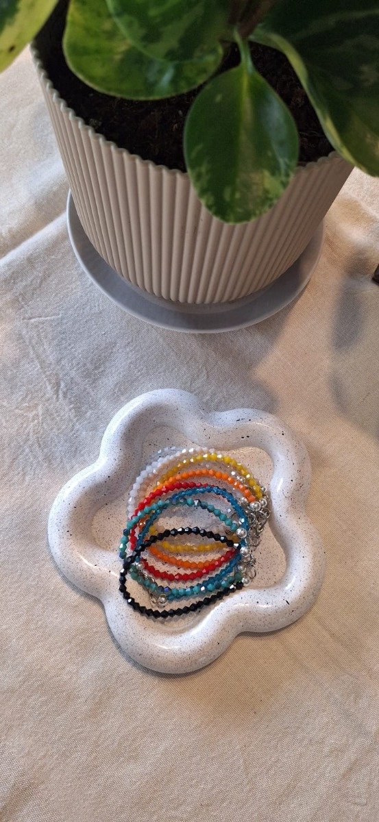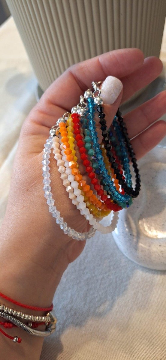 Pulseras realizadas en tanza rígida con cristales acrílicos y mosquetón de acero.