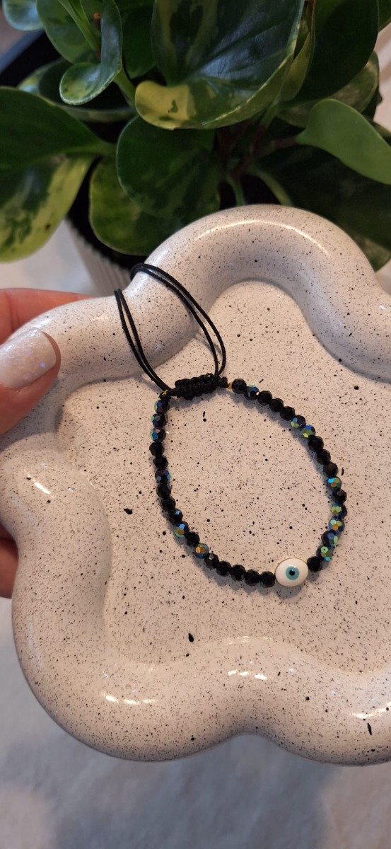 Pulsera de hilo chino negro con cristalitos tornasolados y dije de ojo turco. Ajustable.