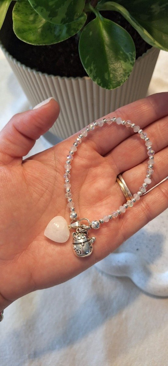 Pulsera de tanza rígida con cuentas de cristales naturales de Ágata teñida, mini bolitas de fundición y corazón de cristal natural