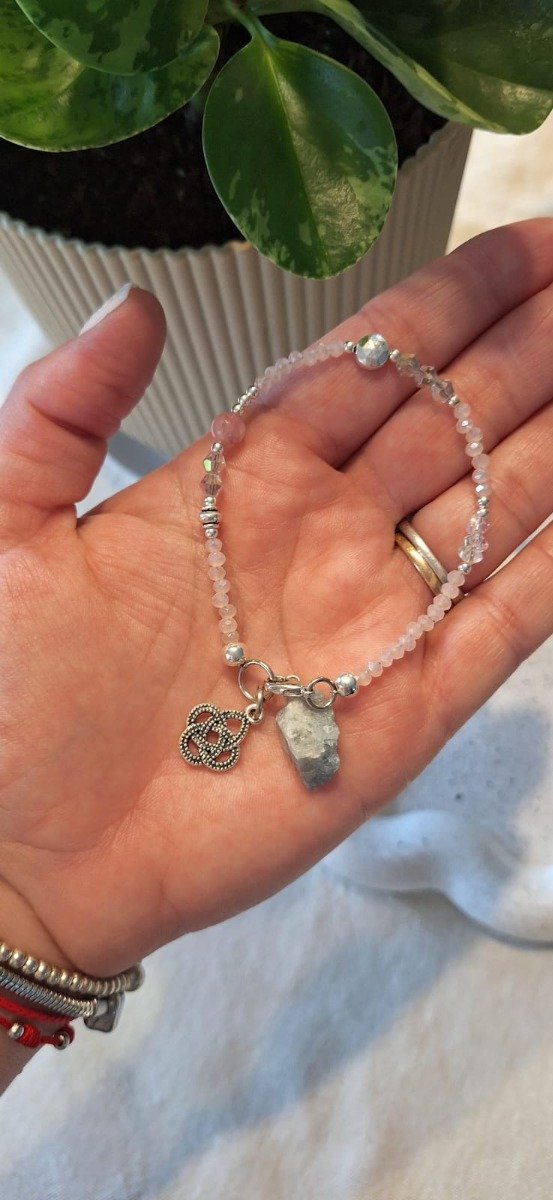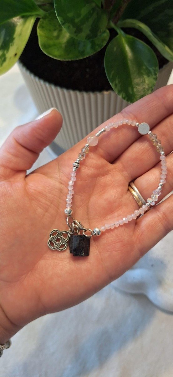 Pulsera realizada con cristales en tonos tornasol, separadores de fundición y un cristal redondo de cuarzo rosa, con dije de nudo de bruja y cristal de turmalina o aguamarina.